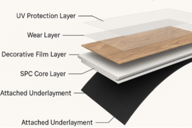 Here’s a breakdown of the layers that make SPC flooring so effective: